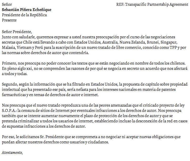 La ONG están llamando y organizando masivamente el rechazo a las negociaciones del TPP a través de una carta pública hacia el Presidente de La República, Sebastián Piñera.