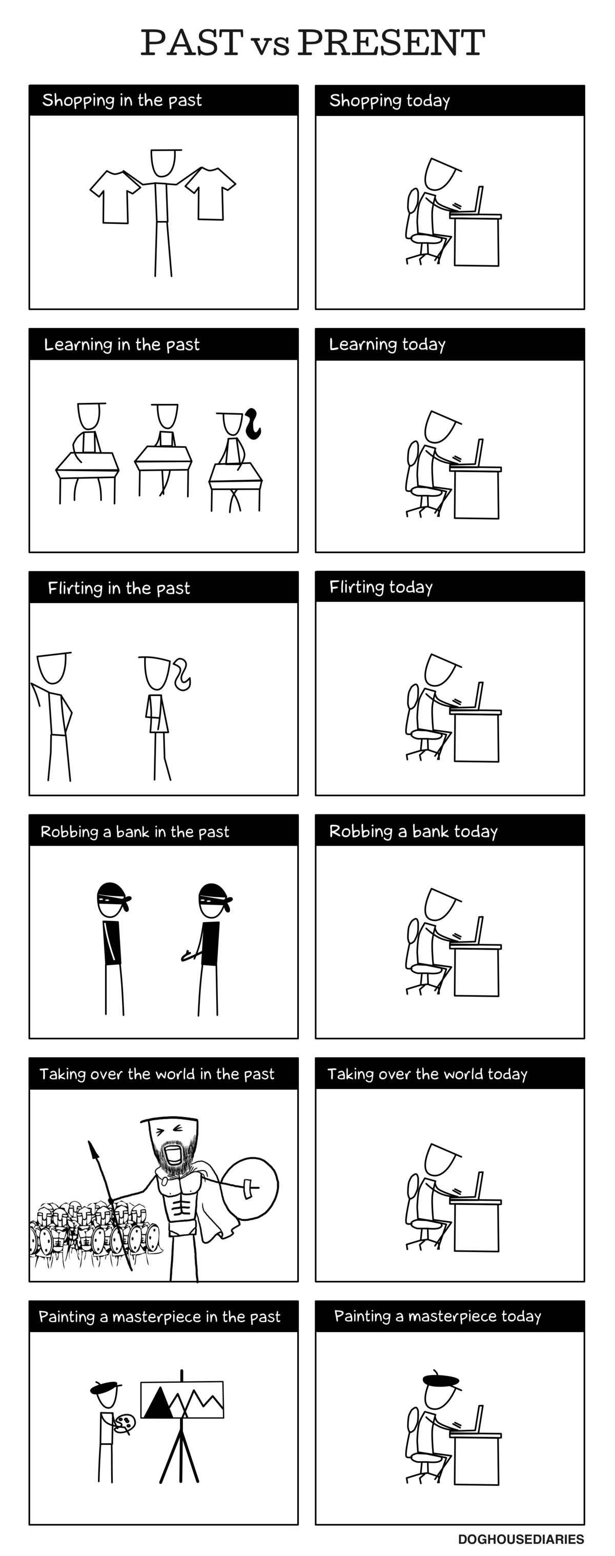 En el siguiente comic de Doghouse Diaries, nos muestra como han cambiado los tiempos gracias a los computadores e Internet, aunque el título del comic es “Pasado vs Presente”, la mayoria de estás actividades ya no solo son posibles a través de un PC, ahora también se puede realizar desde tu celular directamente.