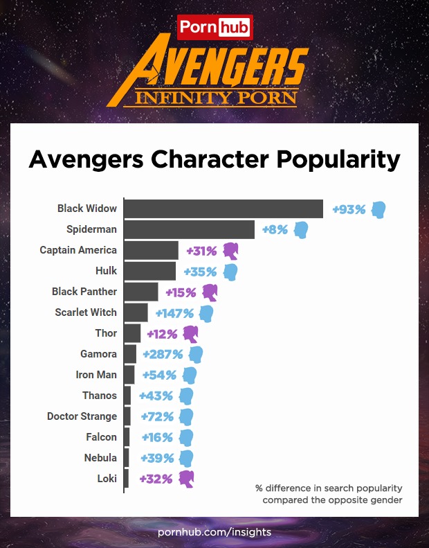 Quizá ya lo imaginabas, pero Pornhub lo ha confirmado. Según un comunicado de la página de contenido para adultos; las búsquedas relacionadas a Avengers aumentaron un 356% desde el pasado estreno de Infinity War.