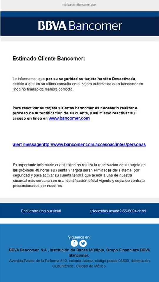 Aunque sea un poco difícil de creer, muchas personas aún caen víctimas de phishing por correo electrónico. Esta semana, uno de estos fraudes parece haber sido altamente exitoso, cobrando tantas víctimas que la Comisión Nacional para la Protección y Defensa de los Usuarios de Servicios Financieros (CONDUSEF) ha tenido que intervenir, advirtiendo a los usuarios de BBVA Bancomer acerca de este nuevo fraude.