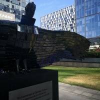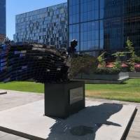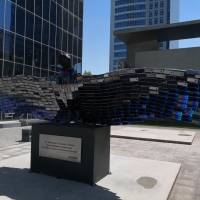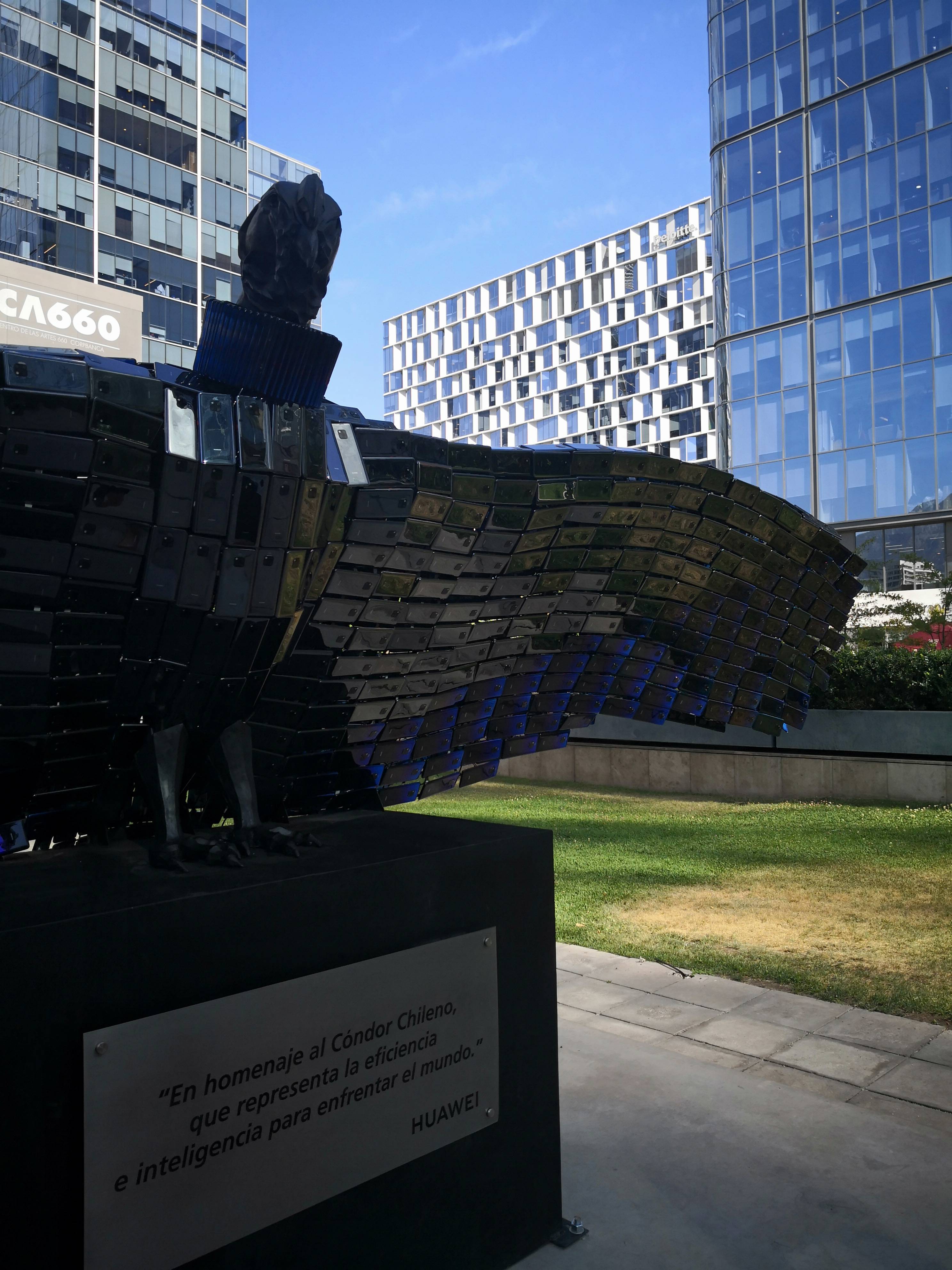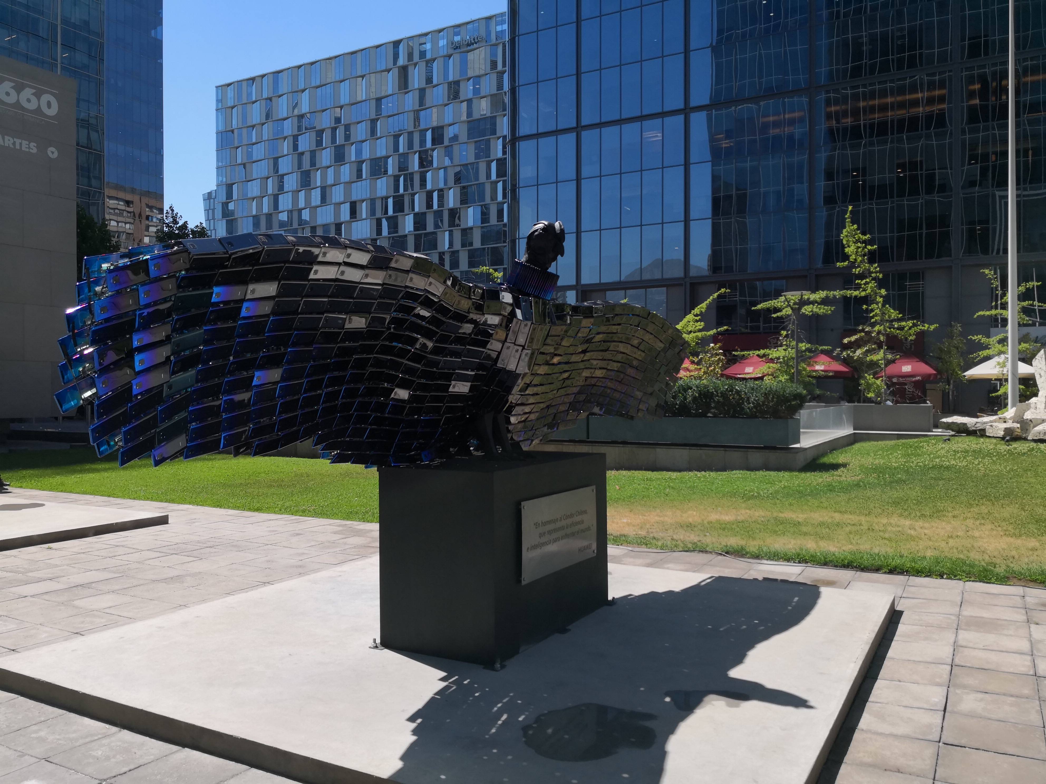 Justo afuera del Edificio Corpartes se instaló una estatua tremenda de un Cóndor Andino, el símbolo patrio chileno, hecho con puros Huawei Mate 20 Pro.
