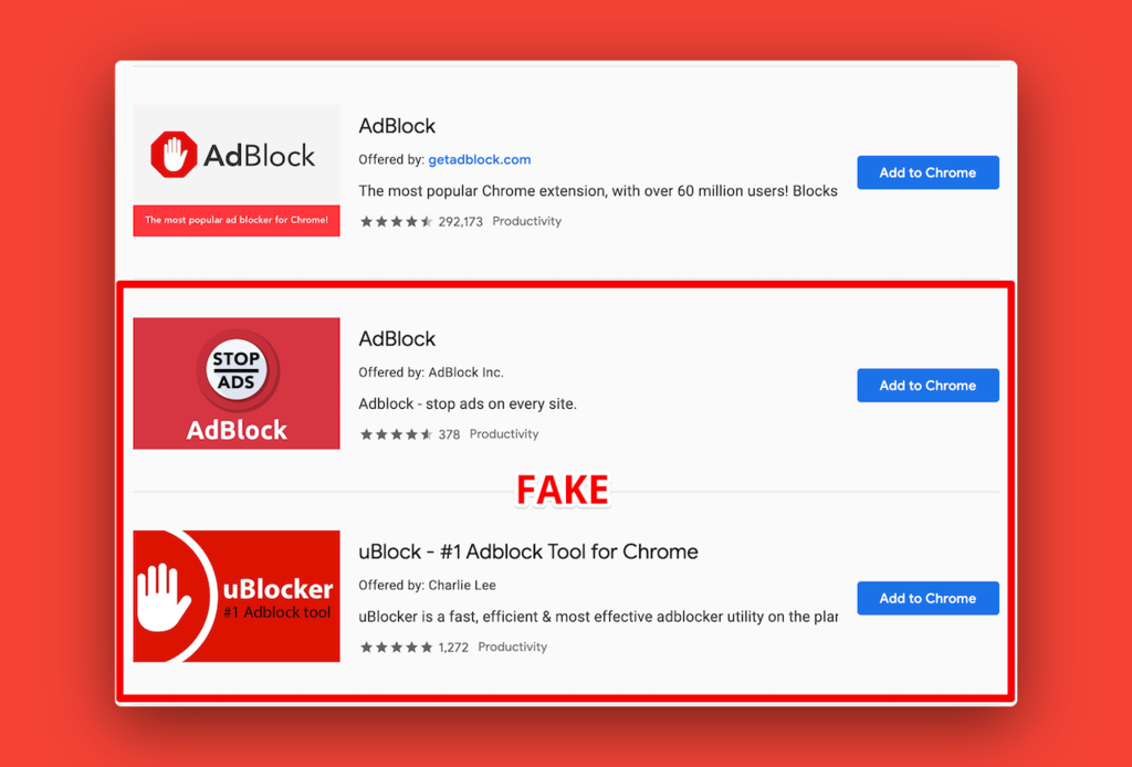 Los responsables de AdGuard explican lo que ya sabemos: esto no es un problema nuevo, en la Chrome Web Store es fácil encontrar versiones falsas de extensiones como AdBlock y hasta al tope de los resultados, sin embargo, la novedad es que ahora además se están usando para cometer fraude a través de cookies.