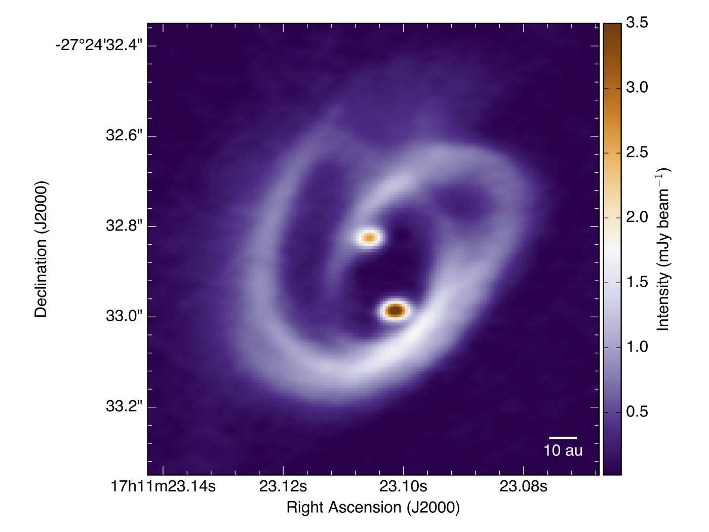 Vemos dos fuentes compactas, que interpretamos como discos circunestelares alrededor de las dos estrellas jóvenes. El tamaño de cada uno de estos discos es similar al cinturón de asteroides de nuestro Sistema Solar, y su distancia mutua es aproximadamente 28 veces la distancia entre la Tierra y el Sol. Ambas protoestrellas están rodeadas por un disco circunbinario con una masa total de aproximadamente 80 masas de Júpiter, que muestra una red compleja de estructuras de polvo distribuidas en formas espirales".