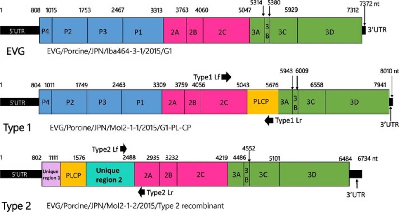Debido a que el EV-G recombinante tipo 1 se detectó en la misma muestra de heces que el nuevo EV-G recombinante tipo 2, este EV-G recombinante tipo 1, que pertenece a (un) subtipo diferente, podría haber servido como virus auxiliar".