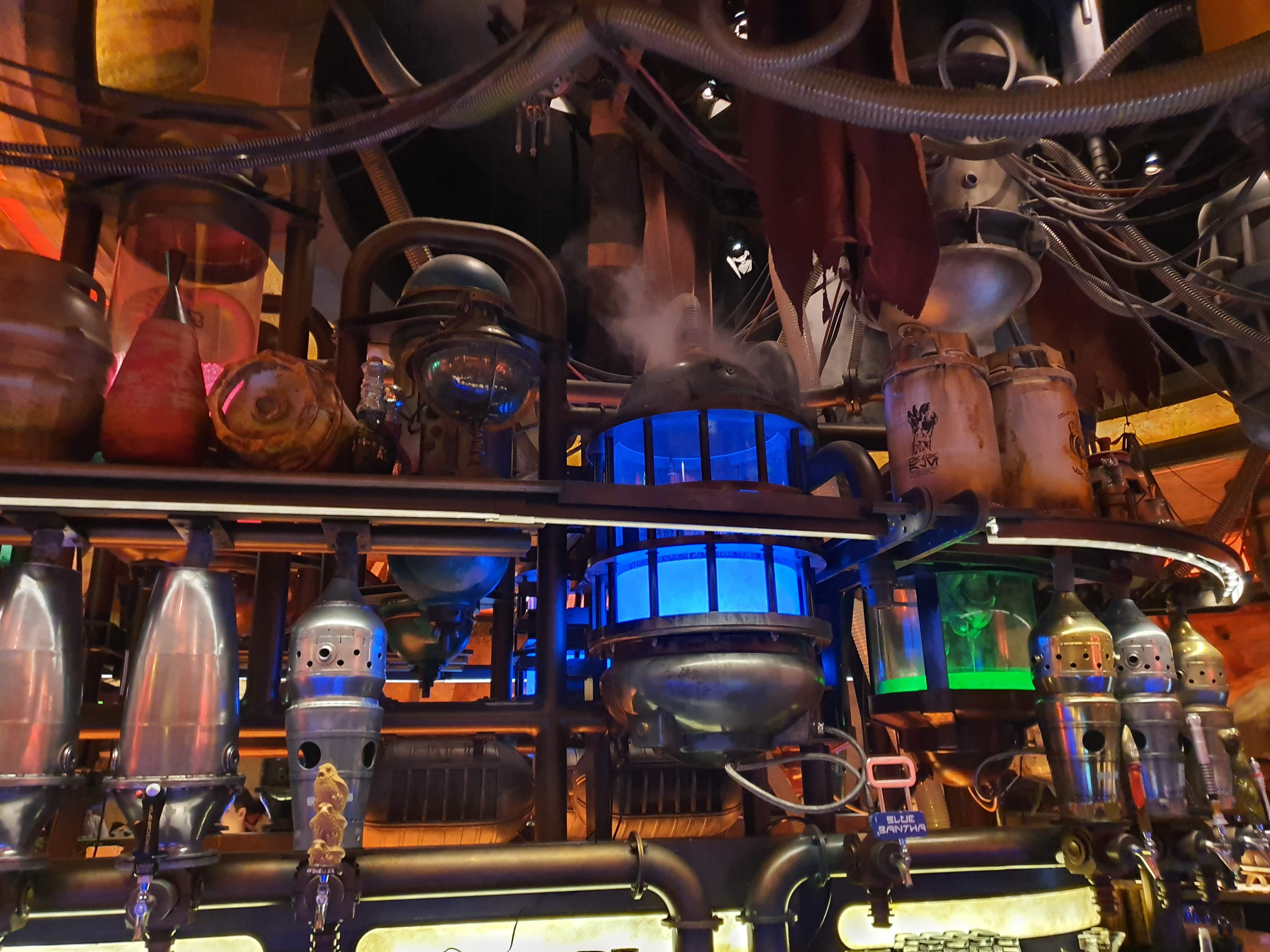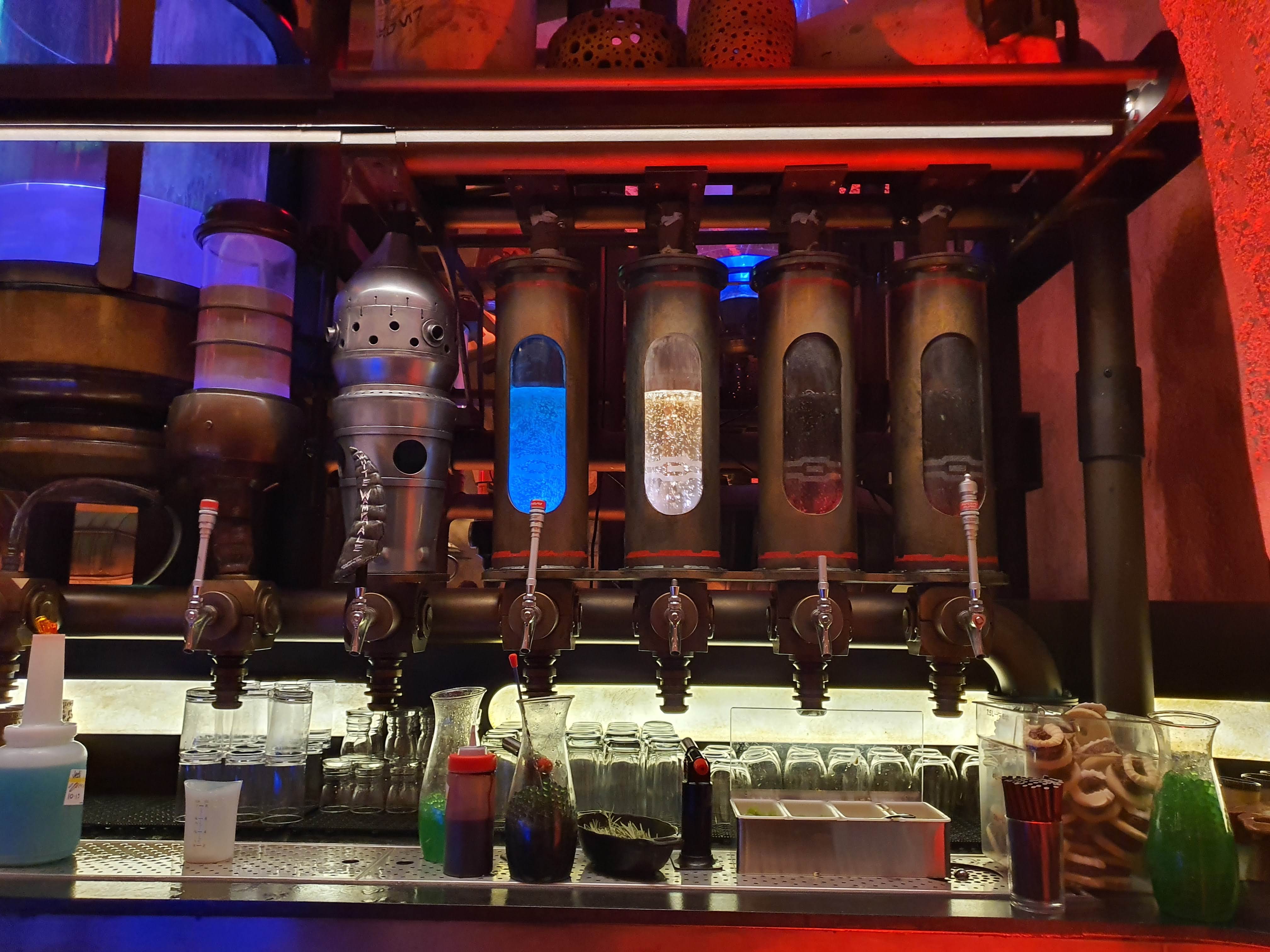 Cada detalle de Oga's es impresionante. La ambientación es un 10/10. Al entrar, lo primero que llama la atención es la barra: redonda y al puro estilo de las películas. Sobre ella, algunas criaturas enjauladas produciendo las bebidas.