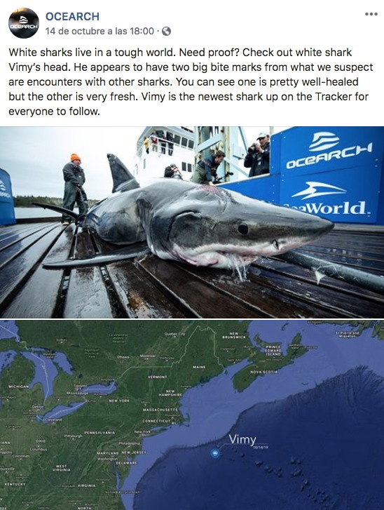Los tiburones blancos viven en un mundo difícil. ¿Necesitas pruebas? Mira la cabeza de Vimy, el tiburón blanco. Parece que tiene dos grandes marcas de mordidas de lo que sospechamos, fueron encuentros con otros tiburones. Puedes ver que una está ya sanada, pero la otra está fresca. Vimy es el nuevo tiburón que tendrá un rastreador para que podamos seguirlo.