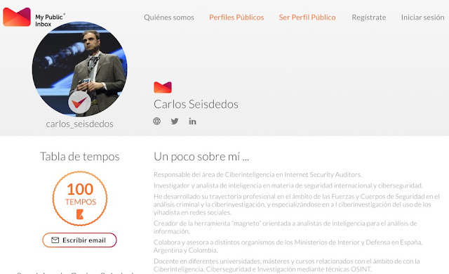 Es ponente habitual en eventos y congresos de ciberseguridad y ciberinteligencia nacionales e internacionales, además de ser autor de múltiples artículos sobre ciberseguridad y ciberterrorismo, y colaborador en diversos medios de comunicación en temas sobre ciberseguridad. Si quieres contactar con él, puedes hacerlo a través de su buzón en MyPublicInbox: Contactar con Carlos Seisdedos.